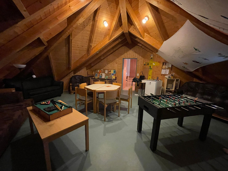 Dieser ist unter anderem mit gemütlichen Sitzgelegenheiten, einem Tischbillard und einem Tischkicker eingerichtet.