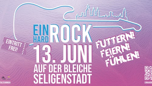 Am Samstag, 13. Juni gibt es auf der Bleiche in Seligenstadt die fünfte Auflage des Festivals "Einhardrock". Zwischen 15 und 22.30 Uhr treten unter anderem die Schulbands der Merian- und der Einhardrschule auf sowie "Secondary Virtues". Diese Seligenstädter Band hatte das Rockfestival im Jahr 2022 ins Leben gerufen, um jungen Nachwuchsgruppen eine Auftrittschance zu ermöglichen. Das städtische Kinder- und Jugendbüro, die katholische Kirchengemeinde St. Marien und die Evangelische Kirchengemeinde Seligenstadt und Mainhausen haben die Idee aufegegriffen und veranstalten "Einhardrock" gemeinsam, in Kooperation mit dem Bund der deutschen Katholischen Jugend Mainlinie und dem Seligenstädter Jugendbeirat. Musik steuern in diesem Jahr auch die Bands "Flying Spoon" aus der Oberpfalz mit Bluesrock, "Lisa ruft an" aus Bamberg mit einem Mix aus Rap, Alternative- und Hard-Rock und die Seligenstädter Cover-Band "Parity" bei. In der Grünanlage zwischen Steinweg, Kapellenstraße und Jahnstraße bleibt es nicht beim Bühnenprogramm: Für Verpflegungs- und Getränkeangebote sorgen Jugend- und Vereinsgruppen, Spielmöglichkeiten organisieren die beiden benachbarten Kirchengemeinde, Sportvereine sowie der Jugendbeirat. Gefördert wird "Einhardrock" von der EKHN-Stiftung - der Kulturstiftung der Evangelischen Kirche in Hessen und Nassau und der Kinder- und Jugendstiftung der EJHN. Nähere Informationen sind unter www.einhardrock.de zu finden.