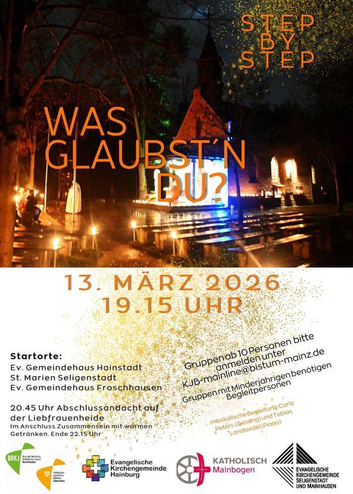 Auch in 2026 geht es wieder "Step by Step" auf die Liebfrauenheide. Wir freuen uns auf Firmlinge, Konfis, Jugendliche, Junge Erwachsene und Junggebliebene! Gruppen bitten wir, sich unter KJB-mainlinie@bistum-mainz.de mit Angabe der Teilnehmendenzahl anzumelden. Gruppen mit unter 18jährigen brauchen eine verantwortliche Begleitung. WIE IN JEDEM JAHR WEISSEN WIR BESONDERS DARAUF HIN, DASS EINE FAHRT AUF DIE LIEBFRAUENHEIDE VON FROSCHHAUSEN AUS DURCH DEN WALD AUCH ZUM ABHOLEN NICHT MÖGLICH UND NICHT ERLAUBT IST. WIR BITTEN DRINGLICH; DAS ZU BEACHTEN! Auch der Hopper fährt die Liebfrauenheide nach unserer Erfahrung an.